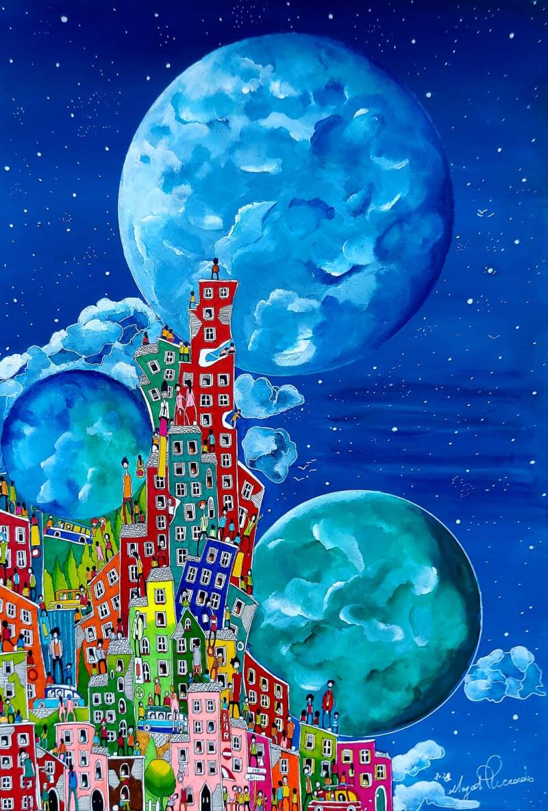 Le mie prime città erano in bianco e nero: praticamente erano dei cubi in 3D, senza nemmeno le finestre. Era tutto molto stilizzato e mi divertivo a sfumare il cielo con la grafite perché ancora non conoscevo bene gli strumenti decorativi. Anche la natura era assente perché non sentivo il bisogno di rappresentare un qualcosa che era già bello di suo. Volevo raffigurare ciò che tutte le persone vivono, e in cui tutti potessero ritrovarsi. Ecco che iniziano ad apparire i personaggi, dapprima un po’ isolati ma, in seguito, sempre più connessi. Li vediamo affacciati al balcone, parlottare col vicino, camminare sulla fune da una finestra all’altra, osservare il mondo dal tetto di casa. È un mondo fantastico, nel senso più letterale del termine, dove la fantasia diventa stupore.